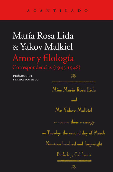 «Hay que presumir que quien hoy esté leyendo esta página sabe cuando menos que María Rosa Lida fue la más sabia, la más lúcida, la más admirada estudiosa de la antigua literatura española en la segunda mitad del siglo pasado, y probablemente de cualquier época. Es menos seguro que sepa también que Yakov Malkiel se contó entre los más solventes expertos en la historia de nuestra lengua, en especial en cuanto rastreador de etimologías. En cualquier caso, ninguno de esos conocimientos es imprescindible: las cartas que configuran el presente libro pueden muy bien leerse como una novela de amor, a ratos rosa, y como el relato de una seducción y de una entrega, con final feliz».